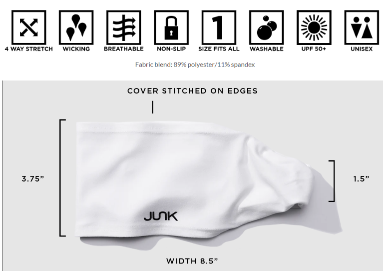 Junk’s technical t-shirt fabric is a breakthrough technology specifically designed to keep you cool while emulating a super comfortable t-shirt feel. This is the best athletic headband you’ll ever wear!