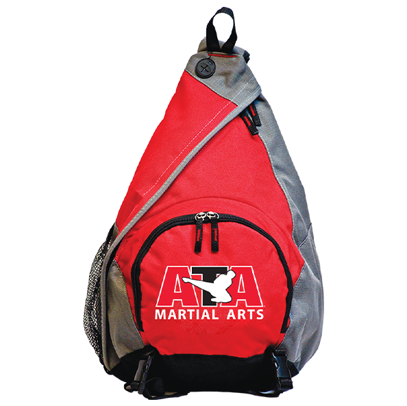 Constructed of durable polyester, this cool sling bag features a headphone exit port on the top, spacious main zippered compartment with an inside hanging pocket, front zippered pocket at the bottom with key holder and organizer, bottom compression straps for holding jackets, fully padded back panel, adjustable padded shoulder strap with cell phone sleeve pocket, and mesh water bottle pocket. ATA logo is featured on the front pocket.
